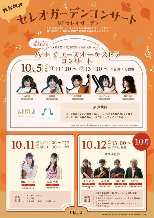 八王子ユースオーケストラの有志メンバーが、芸術祭の一環としてセレオ八王子や地域イベントに登場します。若い世代ならではのエネルギーと瑞々しい感性あふれる演奏で、街の空気を彩ります。会場ではクラシックの名曲から親しみやすいポップスまで、多彩なレパートリーを披露。買い物途中の方や通りがかりの方も気軽に足を止め、音楽に包まれるひとときをお楽しみいただけます。地域の方々と演奏者が直接ふれあい、世代や立場を超えてつながる機会となることも魅力のひとつ。日常のなかに音楽が溶け込み、心がふっとほどけるような瞬間をお届けします。八王子を拠点に活動する若き演奏家たちが、皆さまのすぐそばで奏でる、生の音楽の魅力をぜひ体感してください。