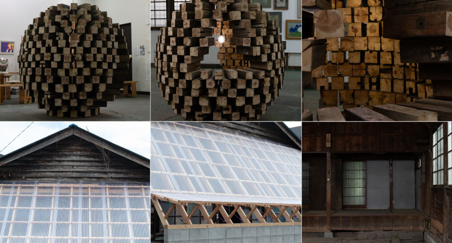 絹の町八王子の発祥の地とも言える片倉製糸場の建物で、近年まで日本機械工業の寮として使われていた木造建築がこの夏解体された。この解体現場からサルベージした木材を使い、メイン会場に小さなフォリーをつくる。また同じ古材を利用して地蔵のような木彫りを子どもたちとデザインし、中野上町特有の、道路とも誰かの敷地とも区別がつかない不思議な場所をピックアップし、街道の町である八王子になぞらえ、6体の地蔵を子どもの守り神として点在させる。今後九小に通う子どもの溜り場になる予定の九小正門前の空き家では、多摩産材とワイヤーによる引張材を駆使し、構造補強を兼ねたファサード改修を行う。